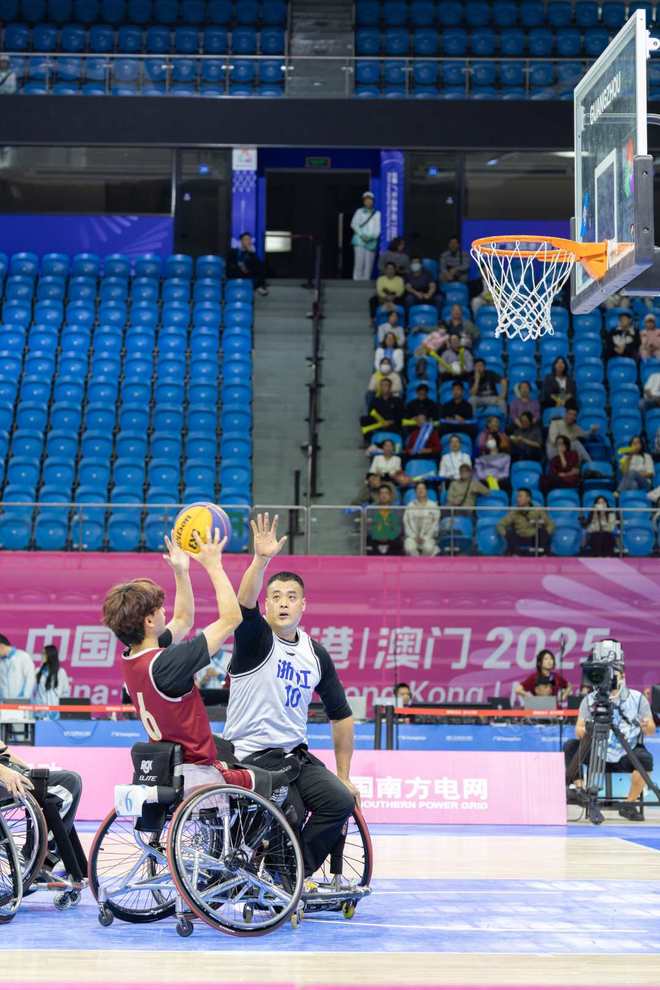 这是全国残特奥会男子三人篮球铜牌赛比赛现场,最终浙江队获得本场比赛胜利。